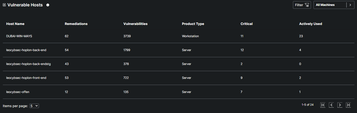 The Vulnerabilities Host table Provides insights on the hostname, Number of remediation available, and number of vulnerabilities for a specific host.