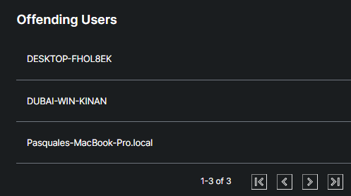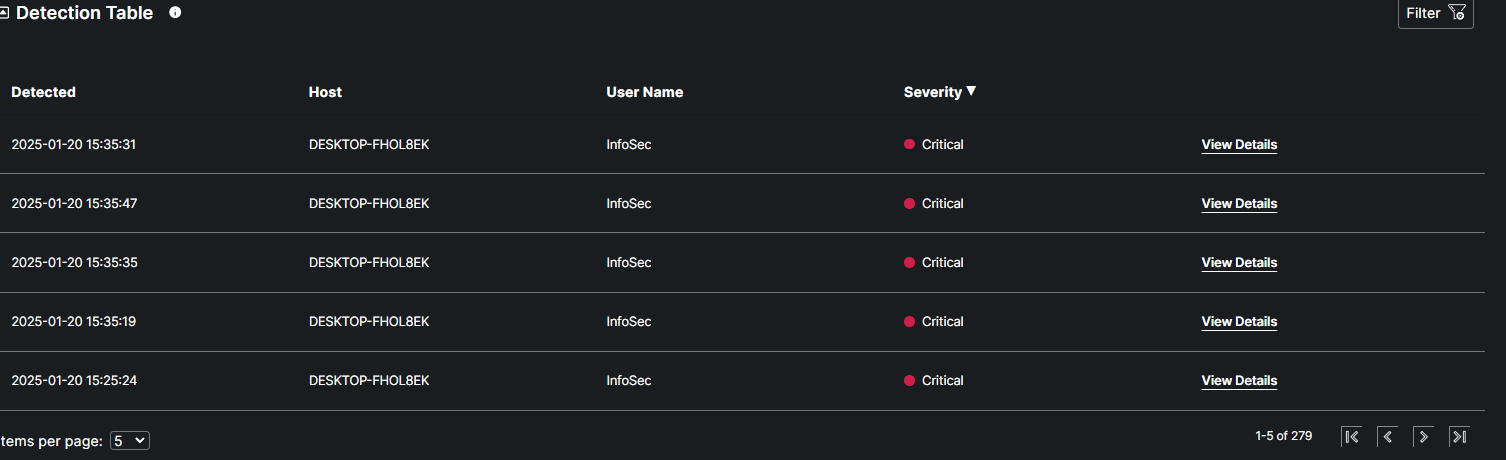 The Detection Table provides detailed information about each detected event, including the Host Name, which identifies the affected device; the Username, which indicates the user associated with the event; and the Severity, which classifies the threat's potential impact. Each record also includes a View Details button, allowing for deeper analysis and further action as needed.