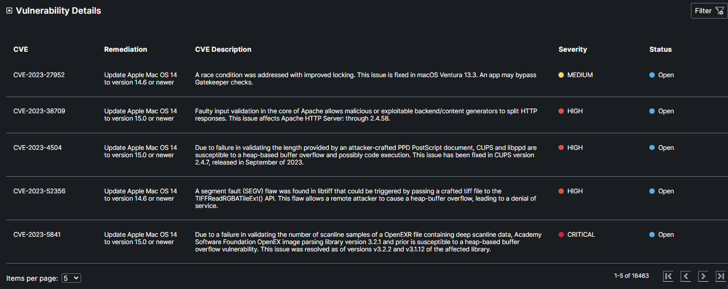 This table highlights specific vulnerabilities identified on a host. Each entry includes the CVE identifier for tracking the vulnerability, a description of the issue, recommended remediation steps, the severity level of the vulnerability, and the status (Open/Closed).