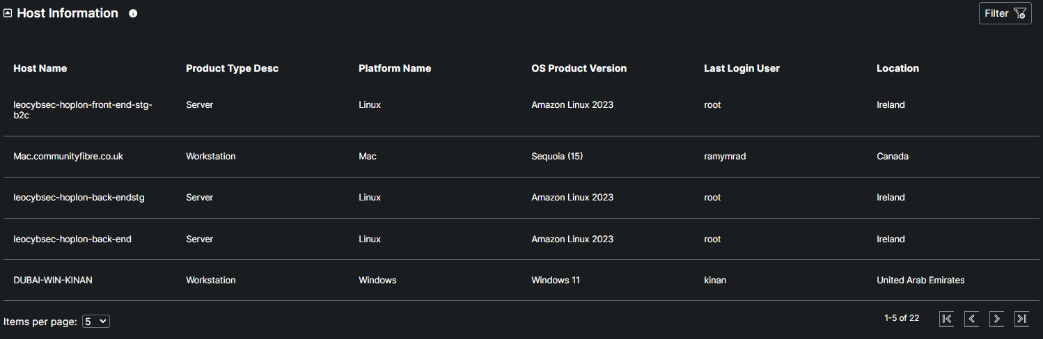 The Host Information table contains essential details about each monitored device, including the host name, product type, platform type, OS product version, last login user, and location, offering a comprehensive view for effective tracking and management.